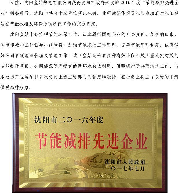 沈阳皇姑热电有限公司获得“节能减排先进企业”荣誉称号