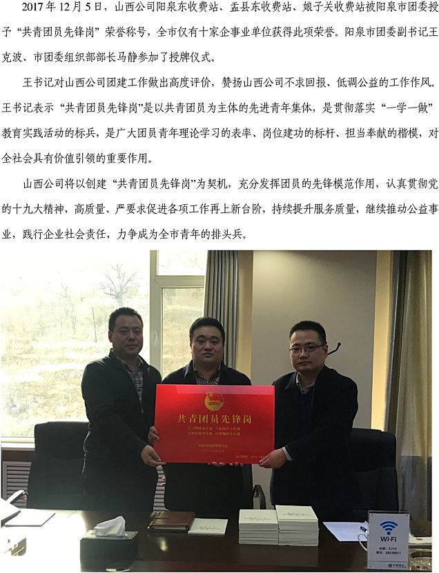 山西公司荣获2017年阳泉市“共青团员先锋岗”称号